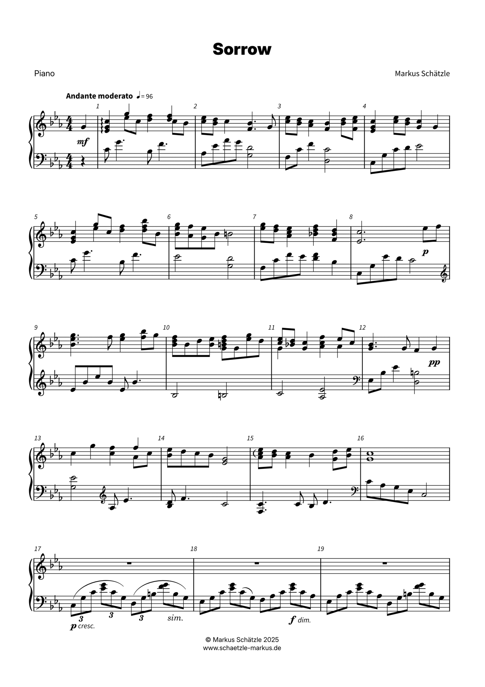 “Sorrow” is a profound musical reflection on the complex emotions of grief and melancholy. In this composition for solo piano, Markus Schätzle explores the darker shades of human feelings. However, woven into the moving and expressive melodies is always a glimmer of hope – a musical silver lining that brings light into the shadows.
